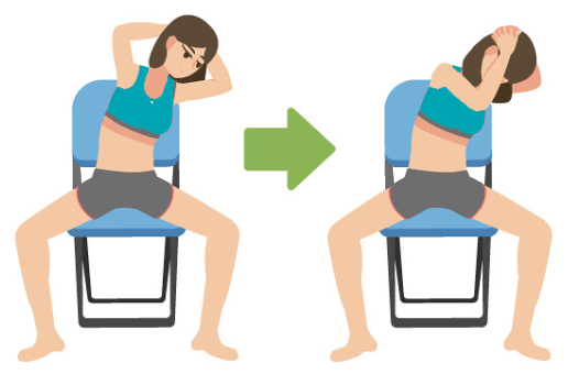 2 注意臀部不要离开椅子,上半身向右倒、伸展左侧腹,维持8秒