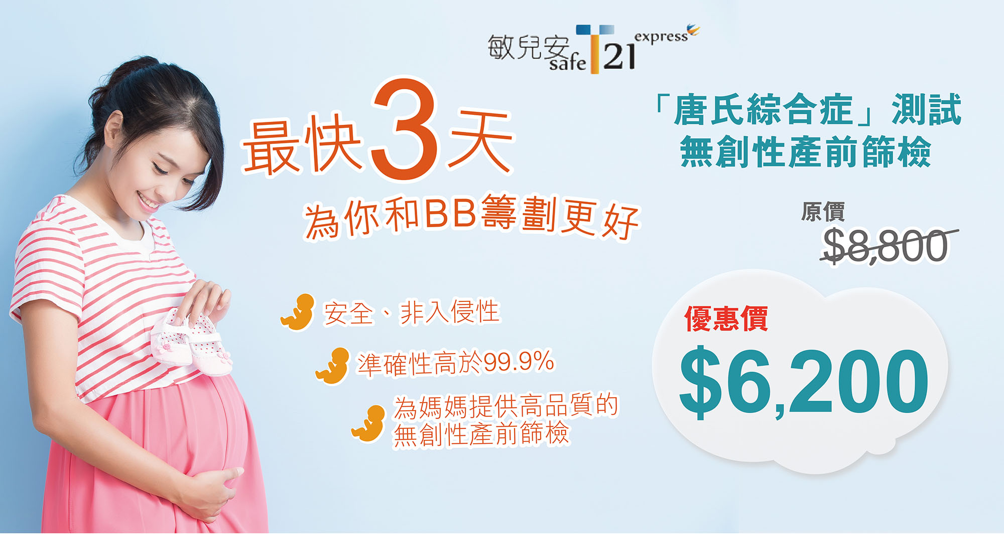 准妈妈可以 优惠价 预约「唐氏综合症」无创性产前筛检,如欲查询或预约,请按此或即致电 +852 3585 8533 联络我们!