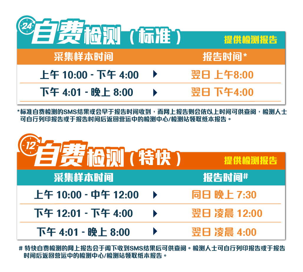 自费检测: 报告会根据您所购买的检测服务 (特快或标准) 在样本采集后12或24小时内发出。如欲了解详细报吿查阅时间,请往上滑至本网页「测试结果时间」部分。