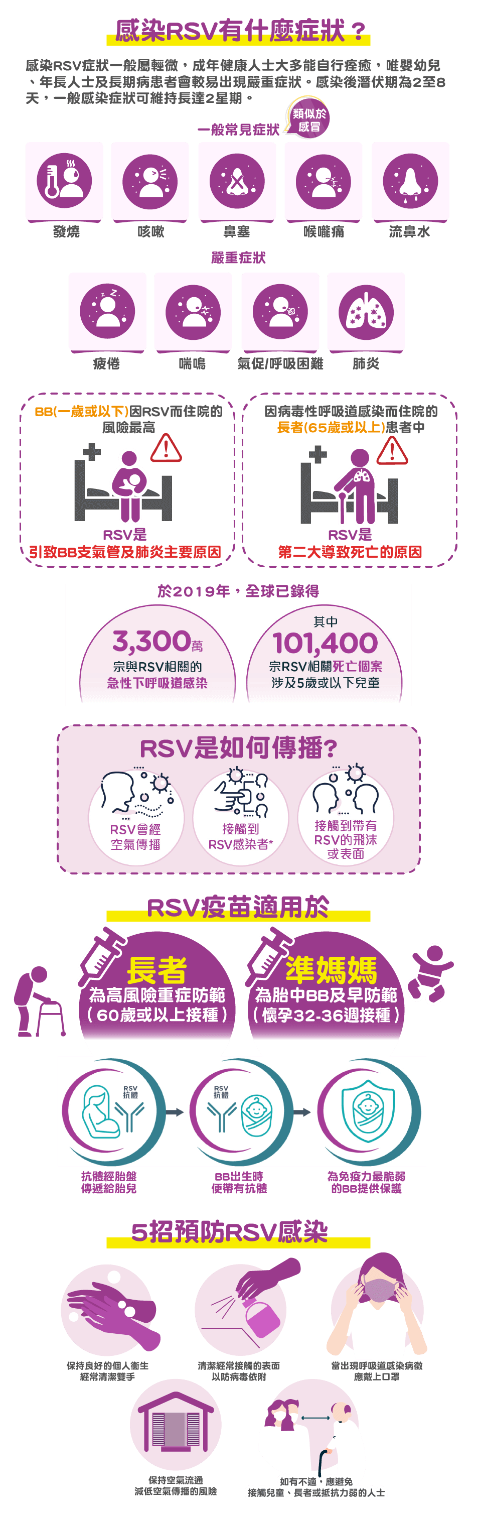 唯一RSV二价疫苗针对 RSV A 及 RSV B 两种病毒亚型。 针对 60 岁或以上长者因 RSV 病毒引起的下呼吸道疾病(LRTD) 初生至六个月大婴儿(于孕妇怀孕32-36周期间接种*)因 RSV 病毒引起的 LRTD 和严重 LRTD |