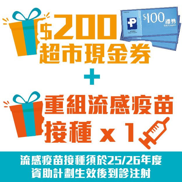 $200超市现金券 + 免费重组流感疫苗接种疫苗接种须为体检计划同一人使用,并须需于25/26年度流感疫苗资助计划生效后到诊