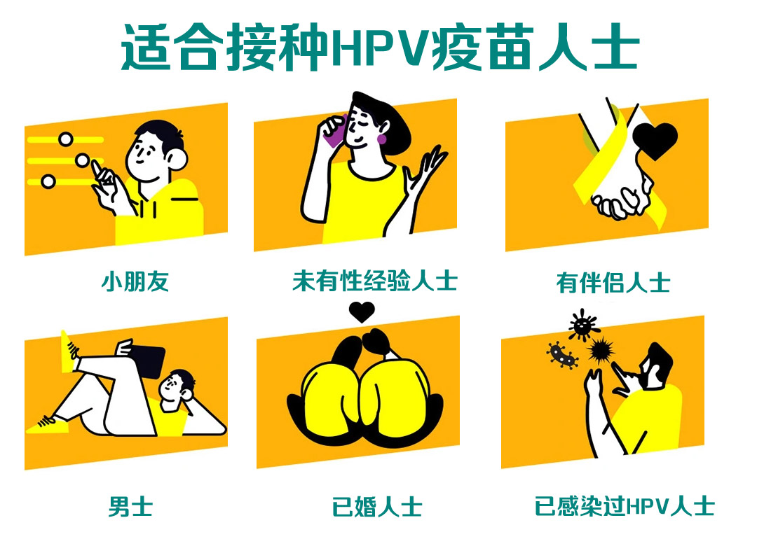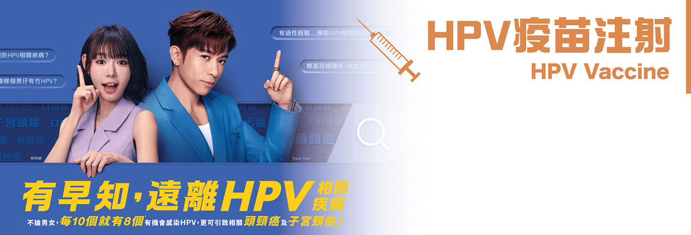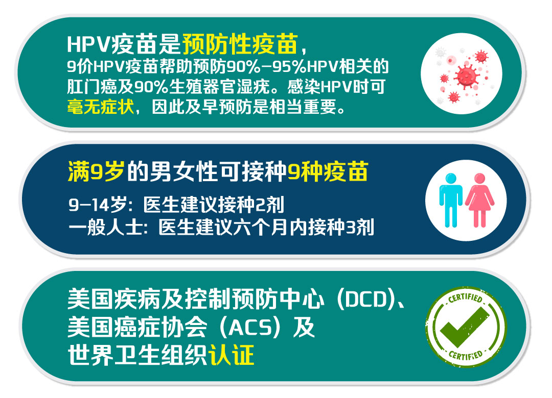 HPV疫苗(子宫颈癌疫苗)是一种预防性疫苗。现时HPV疫苗有效预防9种HPV病毒,包括6、11、16、18、31、33、45、52及58。适用于9岁或以上的女性及男性,男女都有感染HPV的风险及罹患相关疾病的可能,而男士感染后的病征并不明显,因此及早预防相当重要。