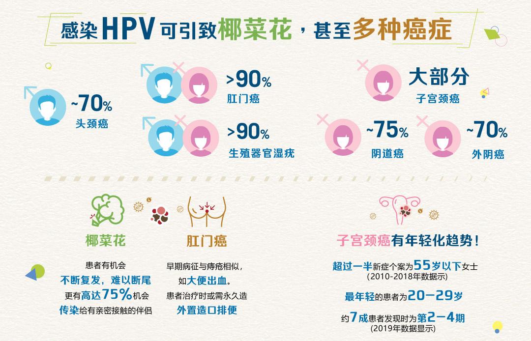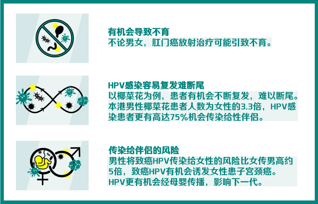 除了头颈癌,亦有机会引致椰菜花及其他癌症,如肛门癌、子宫颈癌等,并有可能导致不育。