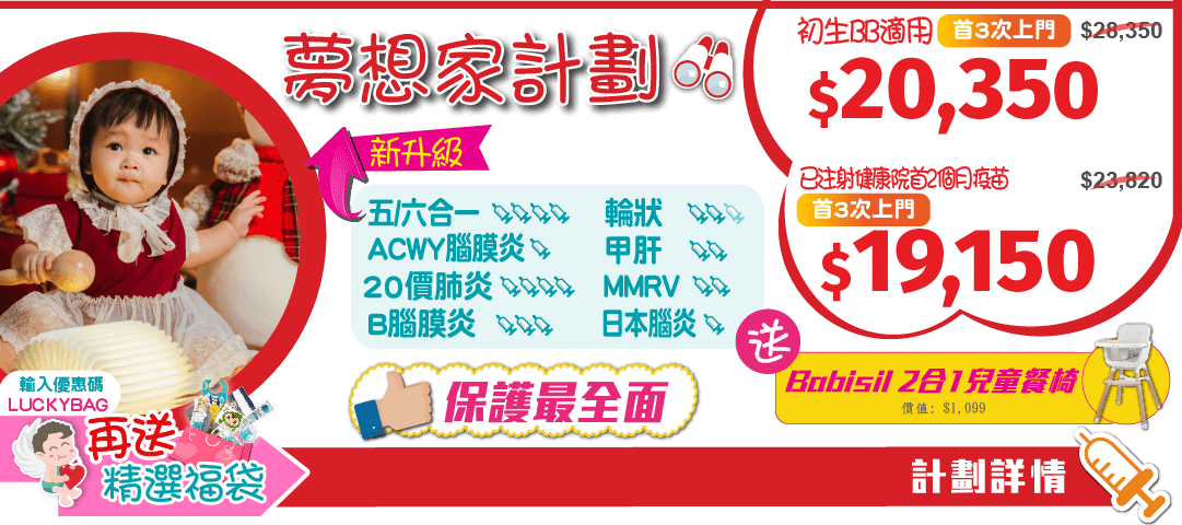 - 上門注射服務: 須依疫苗計劃注射的順序使用,即首次或首2次使用 (視乎贈送次數而定,所贈送或購買的上門注射服務只適用於香港,部分偏遠地區未能提供服務或需額外收取偏遠地區附加費 查閱詳情);