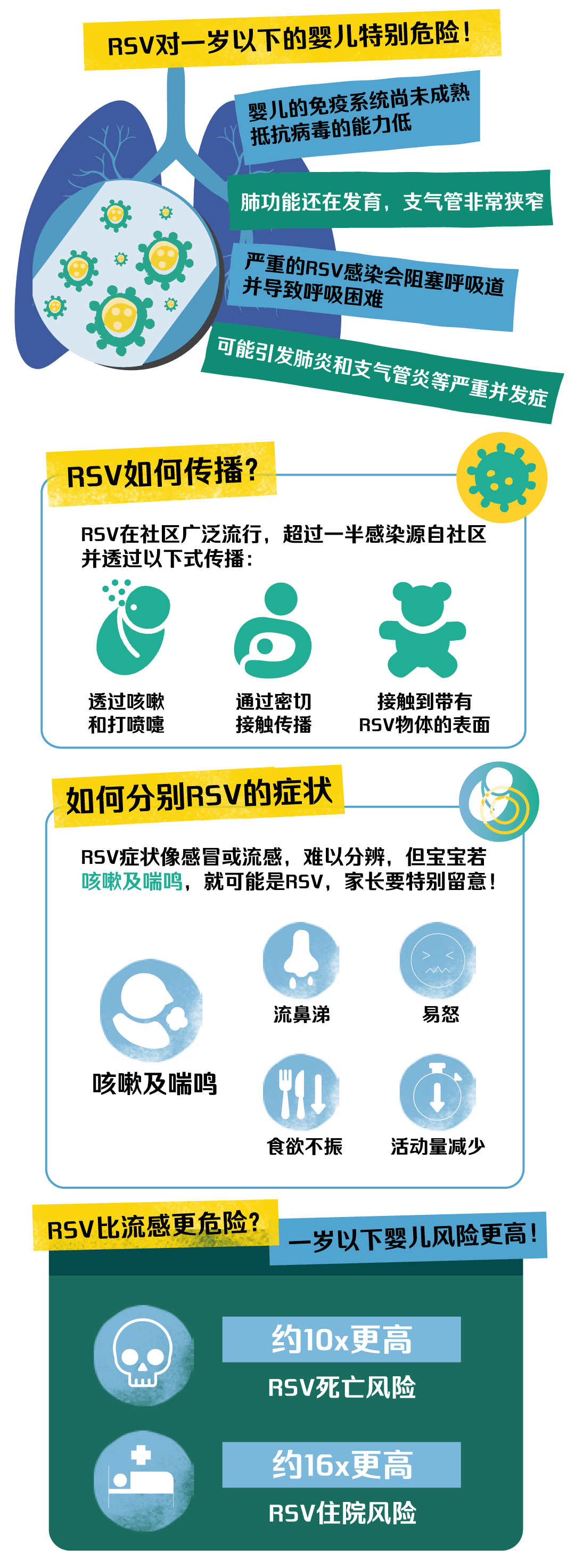呼吸道合胞病毒 (RSV, Respiratory Syncytial Virus) 是一种常见于婴幼儿呼吸道感染病毒,传染性极高,初期症状与感冒相似,恶化速度非常快,可导致更严重的呼吸道疾病或需要住院治疗;在香港RSV感染全年皆可发生。 RSV对婴儿的影响非常大,当中6个月以下婴儿患严重疾病的风险最高。每3名就有2名一岁以下婴儿都曾经感染过RSV;90%两岁以下的儿童都曾经感染,并可导致长期气喘后遗症及增加患哮喘机会。