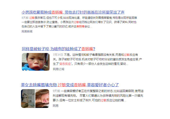 然而,在日常生活中,关于“秒变香肠嘴”的新闻并不少,并且大多都与“过敏”有关。